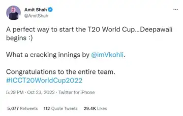 इसके अलावा कांग्रेस नेता राहुल गांधी ने ट्वीट कर लिखा, पाकिस्तान के खिलाफ मैच क्या रोमांचक मैच रहा! दबाव में सबसे बड़ी जीत में से एक। वेल डन टीम इंडिया आगे के मैचों के लिए शुभकामनाएं.' वहीं गृह मंत्री अमित शाह ने ट्वीट कर लिखा, T20 वर्ल्ड कप शुरू करने का सही तरीका दीपावली शुरू क्या शानदार पारी है